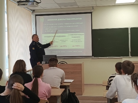 В ходе встречи учащимся рассказали о порядке поступления и условиях обучения в военном училище, подробно рассказали об особенностях профотбора кандидатов. Познакомили обучающихся с условиями проживания и обучения курсантов и с особенностями дальнейшего прохождения военной службы. После выступления обучающиеся могли задать напрямую интересующие их вопросы. Встреча была интересной и познавательной.